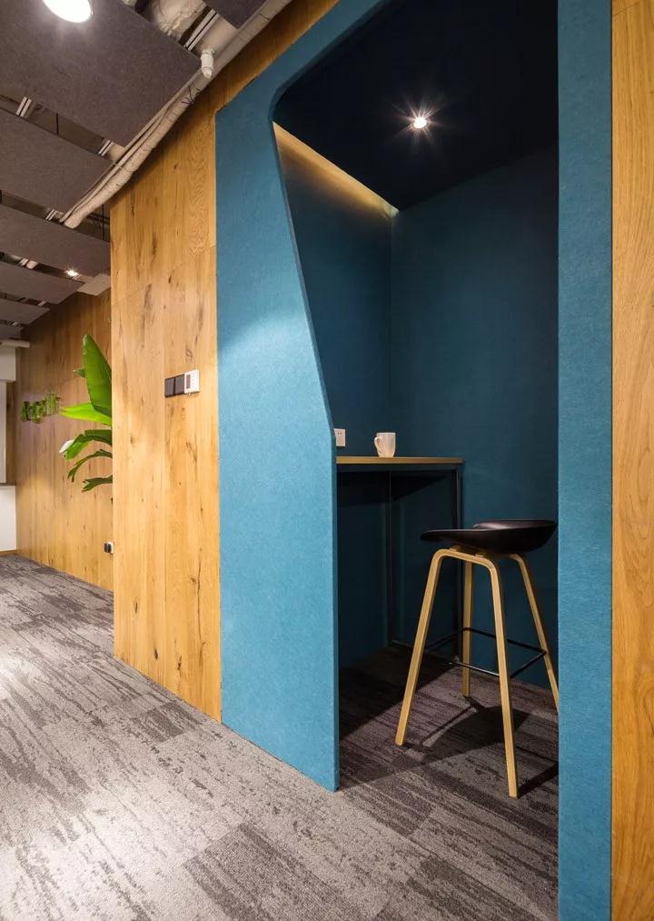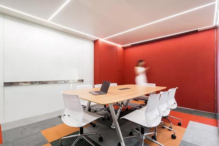 會議室使用了紅色毛氈、白色烤漆玻璃涂寫墻、方塊組合地毯,與白色座椅形成對比。水吧區設有卡座式座位,滿足員工之間交流與討論,體現了公司文化和協作精神。帶有穿孔的毛氈掛板,深圳裝修公司設計師自己動手制作的紅色毛氈燈具、皮革與毛氈結合的隔斷,起到很好的吸音與隔離的效果,通過色彩、家具、手工制品,展示了一個充滿活力、色彩豐富的辦公空間。
