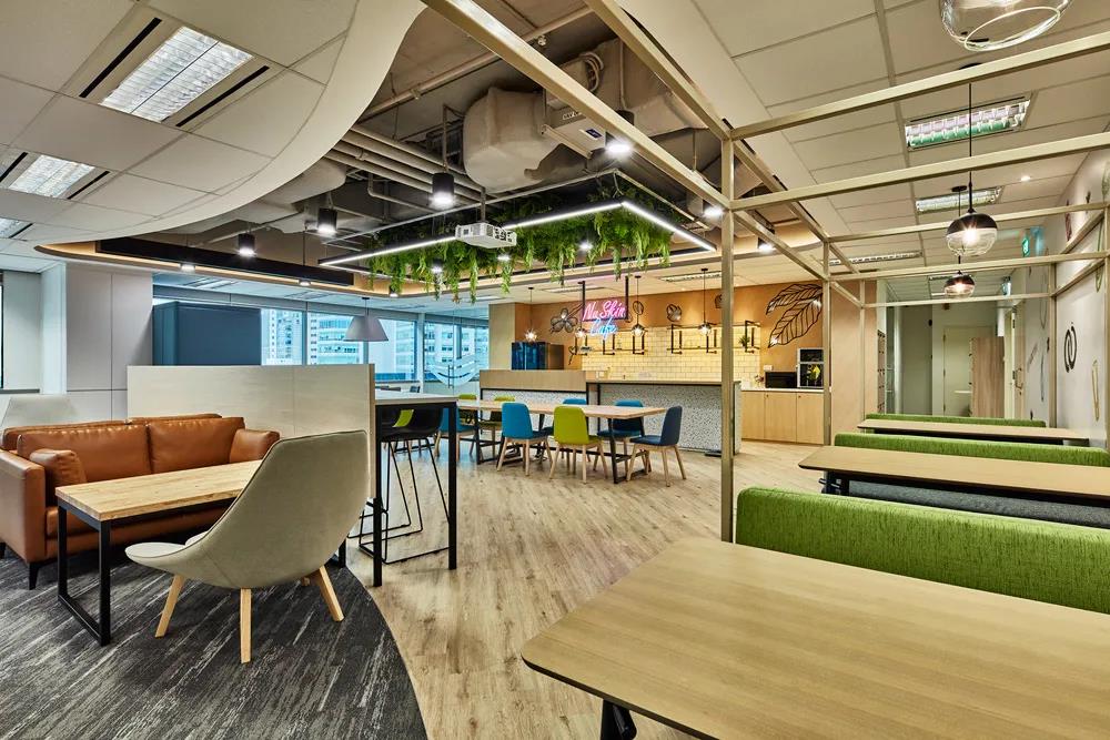 為兼顧開放布局中的活力與私密性需求,方案采用漸進式分區方式。深圳裝飾公司用不同質感的材料劃分活動社交區和重點工作區。辦公室的一端是充滿活力的如新咖啡廳,另一端是以白色為主的安靜空間,為需要專注于工作的員工提供了一個不受干擾的環境。方案充分考慮了后COVID-19時代的工作模式,辦公室裝修設計可以同時滿足現場工作和遠程工作的需求。靈活的空間整合非接觸式數字解決方案,讓如新東南亞保持領先姿態,迎接未來。
