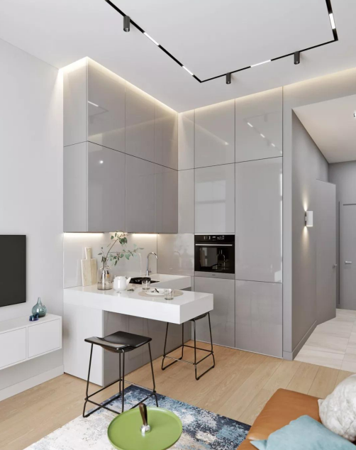 我們在小戶型裝修設計中因空間受限,時常難以妥善規劃,深圳裝飾公司雄宇裝飾便將公私領域一分為二,從玄關進入即可看見一道墻隔開客餐廳與臥室。公空間雖然狹小,但運用斑駁藍白地毯便能簡單作出區隔,此時搭配對比色深橘沙發,就可輕易塑造視覺主焦點,穩定室內不顯紊亂;廚房柜體則透過延續玄關淺灰色調,借此連貫空間營造寬敞感,料理區則保留簡易烹調器具,深圳家庭裝修并且以L型臺面連結吧臺桌面拓展出精簡用餐區。